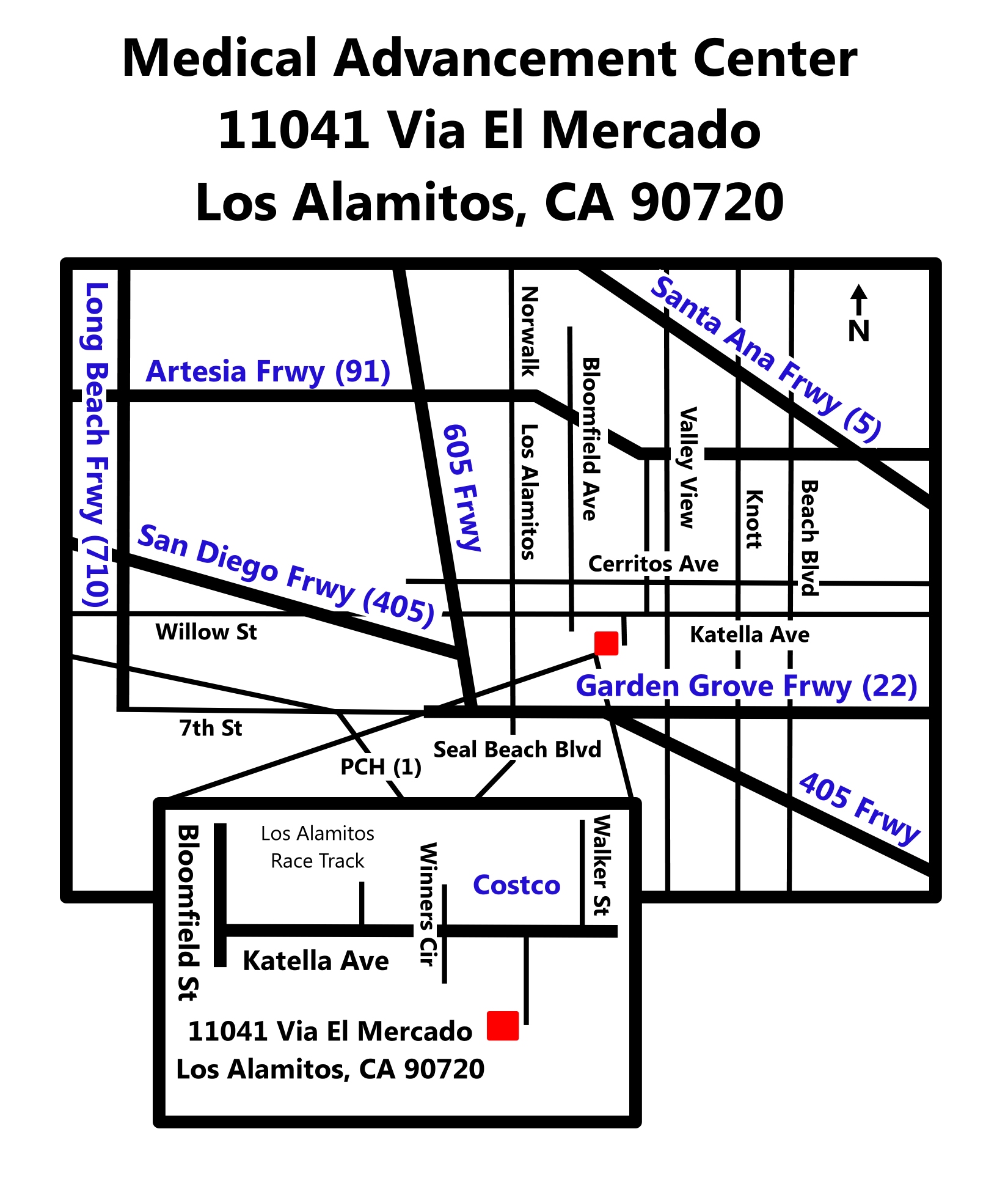 From Katella Ave: Continue east on Katella Ave. Via El Mercado is approximately 2.5 miles east of the 605 Fwy. Turn right onto Via El Mercado, we are on the right, at the end of the street. Via El Mercado is the first street after Winners Circle and across from Costco. The street sign is a little hard to see. If you come to Walker Street you have gone 1 block too far. If you get to Valley View you have gone way too far!